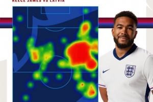 里斯-詹姆斯当选本场比赛最佳球员,英格兰队社媒晒出他此役的热点图,并配上火焰的表情符号,称赞他的出色表现。
